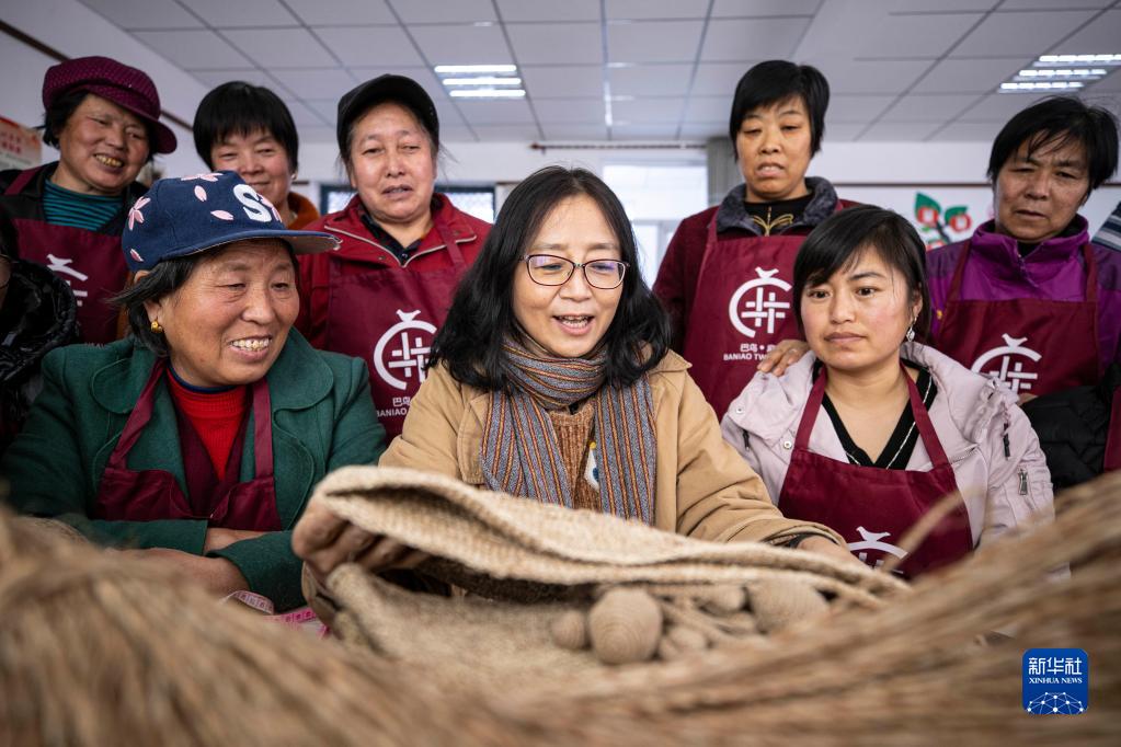 在宁夏银川市月牙湖乡滨河家园四村非遗麻编手工坊,张璟(前中)查看村民们制作的产品(3月4日摄)。
