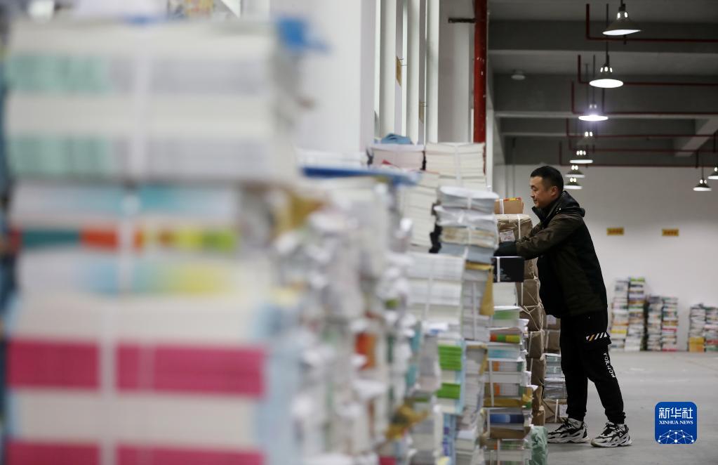 2月13日,在湖南省资兴市新华书店仓库,工作人员在清点教材。