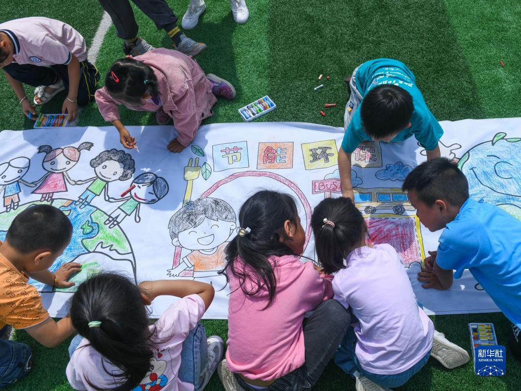 6月14日,余姚市凤山街道第四中心幼儿园的孩子们,在志愿者的带领下一起绘制“节能低碳”绘画长卷。