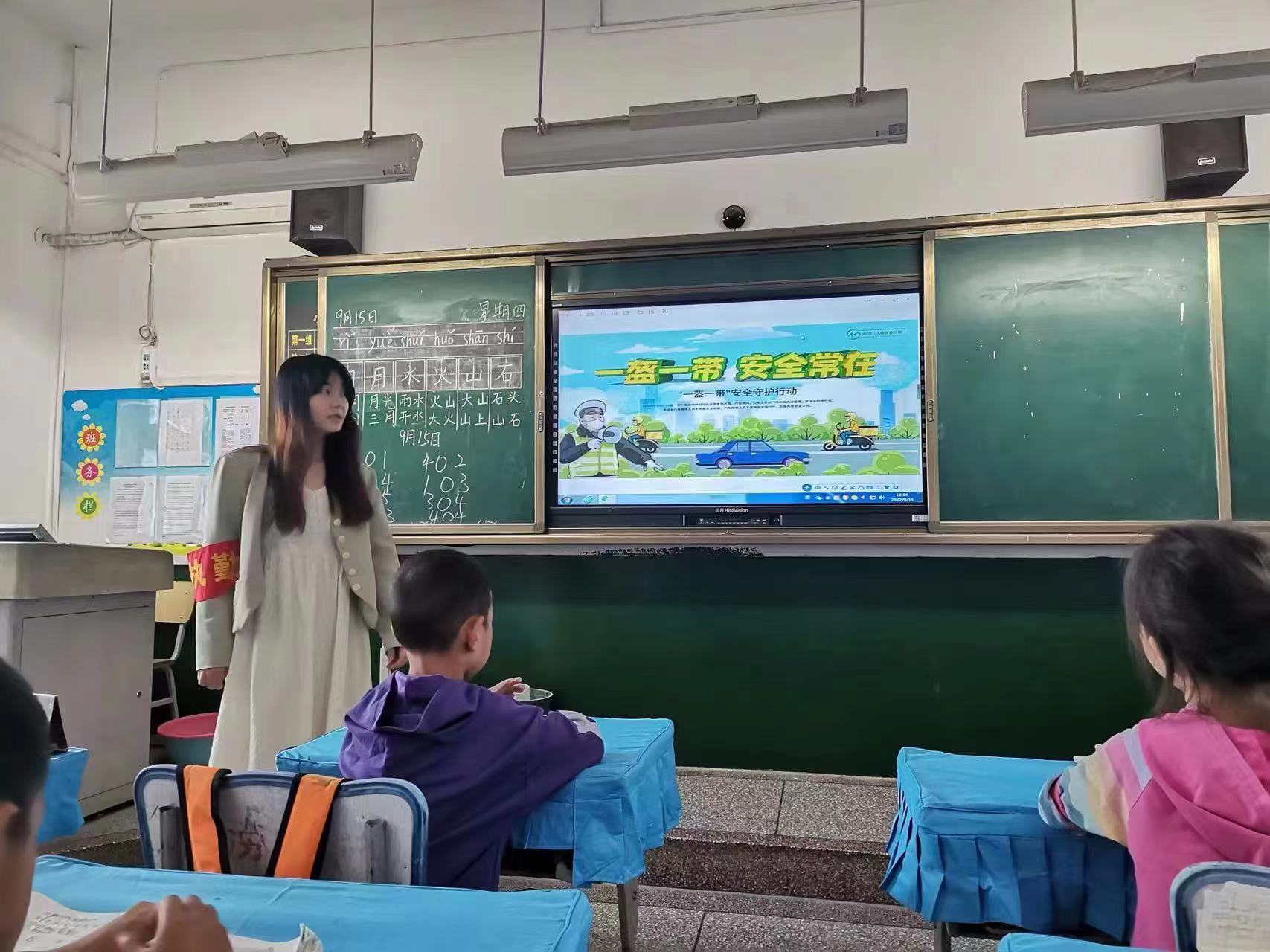 早晨七点多,副校长郝举周带领老师和第五中队少先队员们在马路边向学生和家长发放“一盔一带”倡议书,开展“一盔一带”交通安全宣传活动。在下午的班会上,各班主任利用班会时间开展“一盔一带”交通安全教育主题班会。