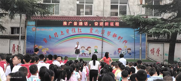 在国旗下举行全校性的推普周启动仪式,宣读倡议书,号召全校师生积极说普通话、用规范字,使普通话成为校园语言。