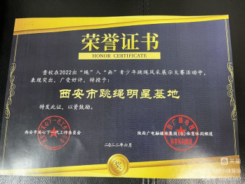 2022年6月,在西安市关工委和陕西电视台体育休闲频道联合举办的出“绳”入“画”青少年跳绳风采展示大赛活动中,西安工业大学附小九名学生荣获“最优小明星”称号,其中王诺伊同学获得特等奖、王钰涵、安俊驰、安泽熙、解铭同学获得二等奖,严子乔、王伊诺、陈芊颖、白凯文同学获得三等奖。我校被评为“西安市跳绳明星基地”。