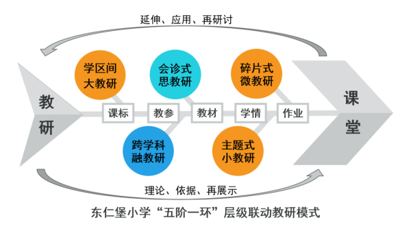 为落实“宝鸡好课堂”,促进教师团队建设,开学初金台区东仁堡小学对各教研组进行了功能重组,并以不同层级的教研活动为载体,构建起“五阶一环”层级联动教研模式。将学区教研、学科融合教研、大学科组、年级组、备课组的发展与骨干教师、成长期教师、新手期教师的成长融为一体,以促进不同层面教师的专业发展。