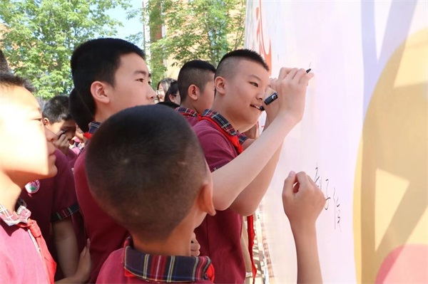 典礼最后,举行了学生代表为毕业班老师献花、行燕伋礼仪式,在催人泪下的瞬间诠释了中华民族尊师重教的优良传统。学校领导和毕业班全体师生还进行了签名活动。