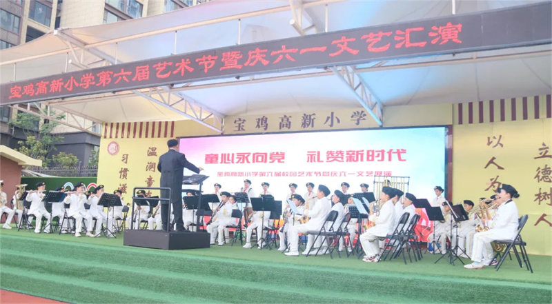 初夏蝉鸣笑声甜,拂面柳风六月天。5月30日,宝鸡高新小学举办主题为“童心永向党,礼赞新时代”的第六届校园艺术节暨庆六一文艺展演。宝鸡高新区教体局副局长罗嫣、聚旺集团宝鸡区域副总经理赵永强、宝鸡市音乐家协会顾问高德里、宝鸡市音乐家协会主席左生明、马营镇凉泉村党支部书记孔军利,马营镇郭家崖村党支部书记赵晓红应邀参加活动,与高小师生共同庆祝孩子们的节日。