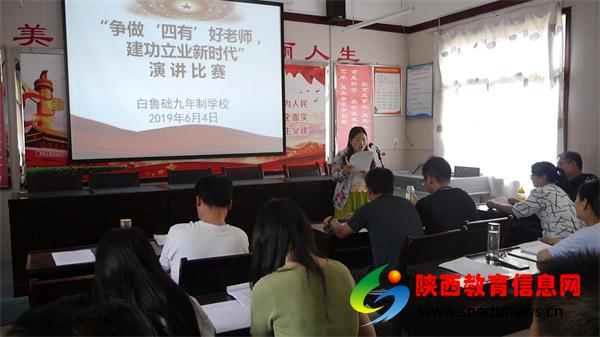 陕西教育信息网讯(通讯员 权印)为深入贯彻习近平中国特色社会主义思想和党的十九大精神,以学习贯彻教师职业行为“十项准则”为重点,以提高教师职业道德水平为目的,强化师德教育,弘扬高尚师德,提高师德建设水平,促进教师队伍素质的整体提高和教育事业健康发展。6月4日下午,商南县十里坪镇白鲁础九年制学校全体教职工欢聚会议室,隆重开展以“争做‘四有’好老师,建功立业新时代”为主题的演讲比赛。